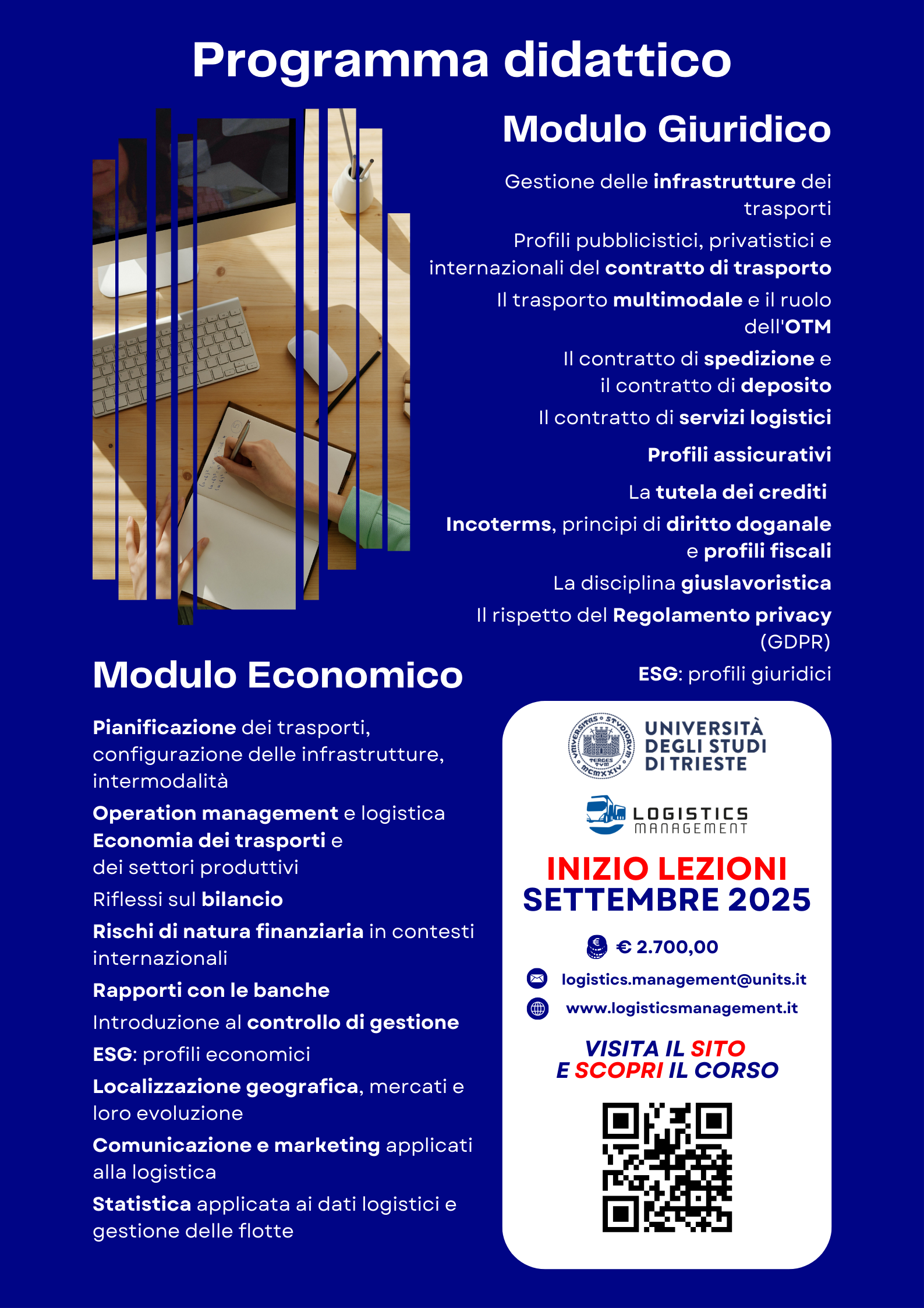 Il programma didattico si articola in due moduli principali attinenti, rispettivamente, ai fondamenti delle scienze giuridiche ed economiche del settore della logistica e dei trasporti, le cui lezioni sono caratterizzate da un taglio estremamente pratico e dall’esame di numerosi case study, sì da rendere le competenze acquisite concretamente spendibili nel mondo del lavoro.
